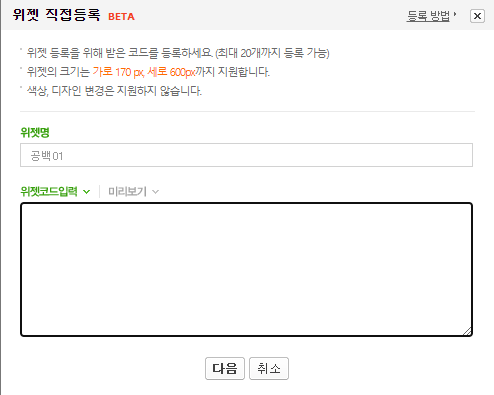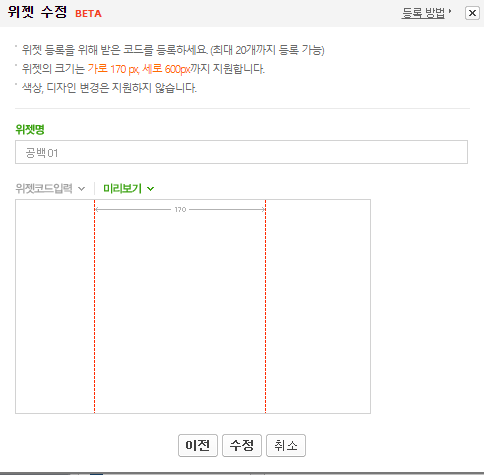 공백 위젯을 1열에 넣은 이유는 위에서도 언급했듯 네이버에서 지원하는 위젯의 최대 크기가 가로 170px, 세로 600px이기 때문에,