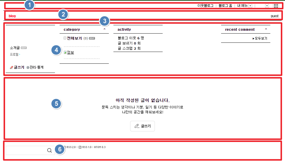 위 이미지에서는 5번 본문 영역보다 위에 있지만 홈페이지형 블로그를 만들 때는 일반적으로 본문보다 아래로 내리는 것이 깔끔하고 이 글에서도 그렇게 할 것이다.