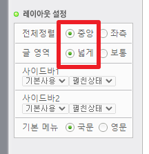 글 영역은 모바일 기기를 고려하여 일반적으로 보통 (좁은 것)으로 설정되어 있는데 PC로 접속하더라도 모바일 버전으로 자동으로 바뀌기 때문에 우리는 PC버전을 고려한 디자인을 할 것이기에 글 영역도 넓게로 바꾸어 준다.