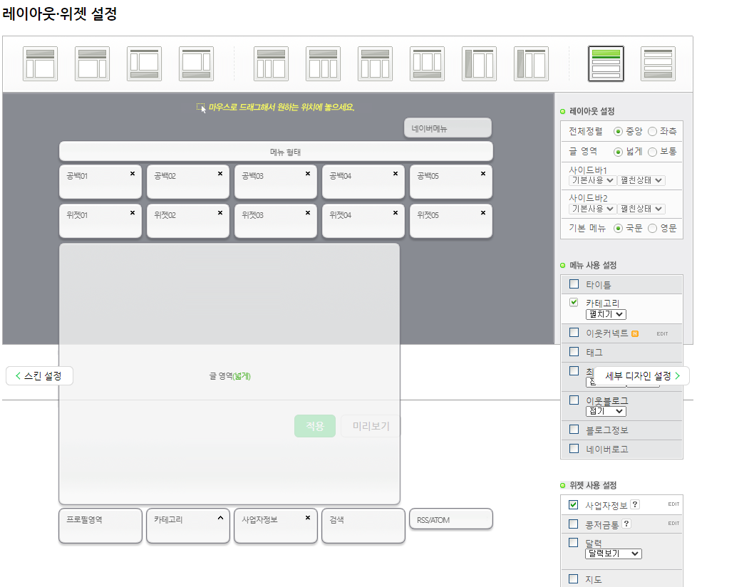 드래그앤 드랍으로 간편하게 블로그의 구성을 바꿀 수 있는 편한 툴이다.