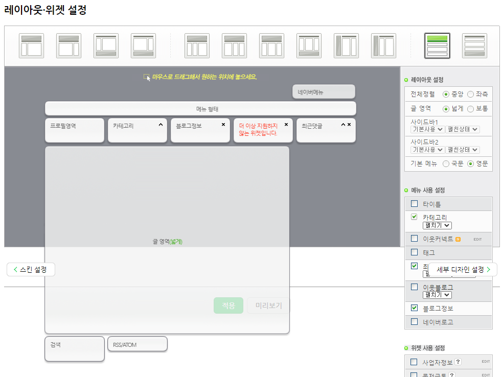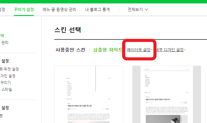 블로그 관리 - 꾸미기 설정 - 스킨 선택 - 레이아웃 설정으로 진입한다.