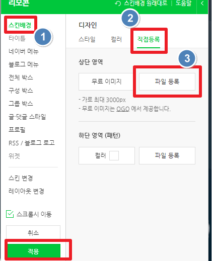 스킨배경 - 직접등록 - 파일 등록을 눌러 내가 방금 만든 이미지를 업로드하고 마지막으로 적용을 눌러 이탈하면 된다.
