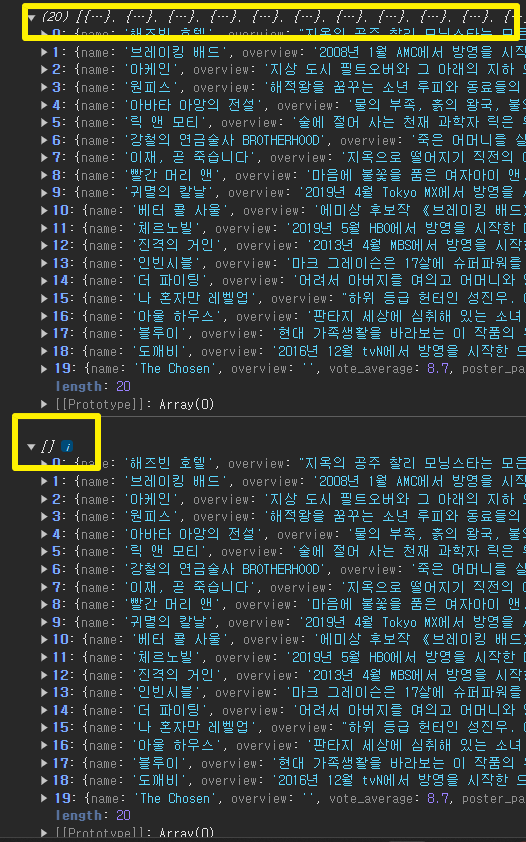 하나는 [] 빈 배열 처럼 보이는데 화살표를 누르면 여러 개의 객체로 이루어진 배열로 보임.