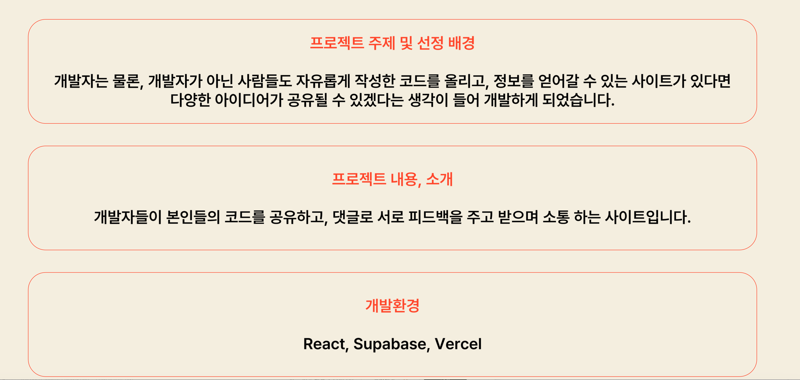 - 개발자 뿐만 아니라 비개발자도 본인이 작성한 코드를 올리고, 질문하고, 정보를 얻을 수 있는 플랫폼을 기획했습니다.