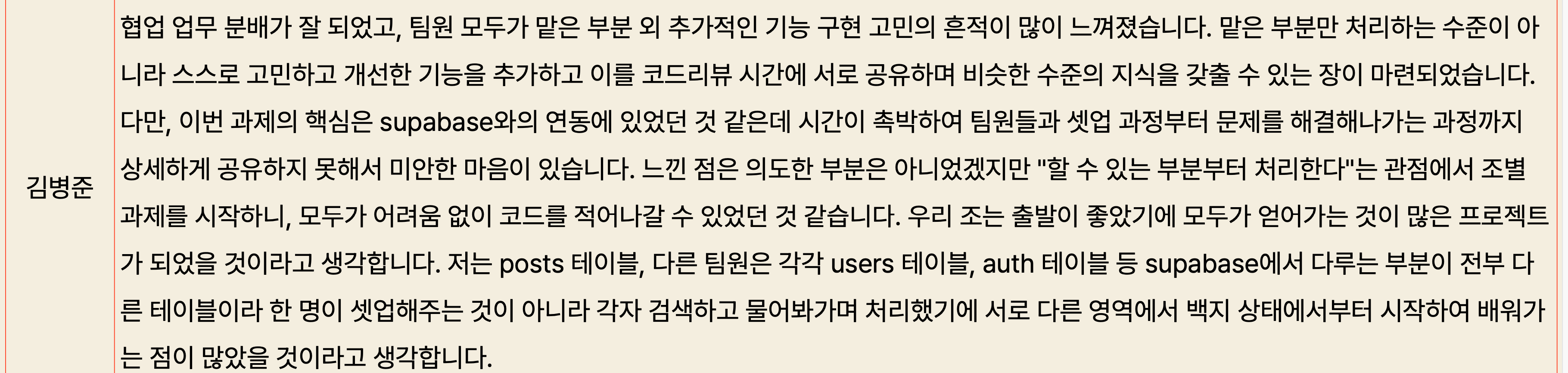 - 또한 예측하지 못한 에러가 너무 많아 supabase 공식문서를 계속 살펴보며 개발을 해야 하는 어려움이 있었지만 회원가입 기능을 맡은 김휘진님이 튜터님들도 찾아 뵙고 늦은 시간까지 다양한 시도를 해보며 기능을 완성시킬 수 있었습니다.마이페이지