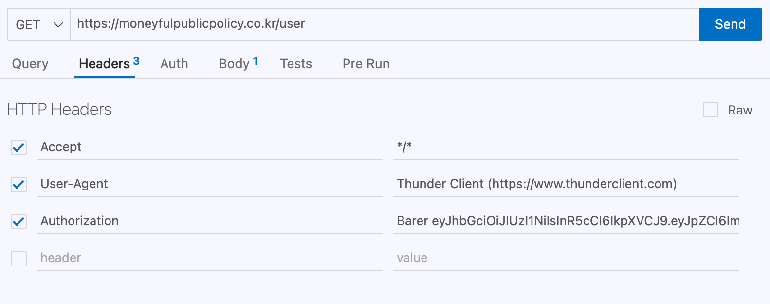 API Method는 GET, URL Path는 /user이며, Body는 없으니 지금까지 입력했던 내용을 전부 지우고 Headers에 Authorization 속성을 추가한 후 아래와 같은 형태로 입력해준다.