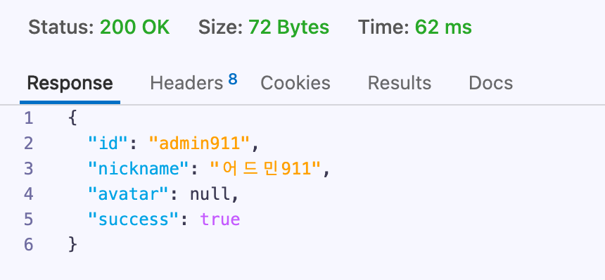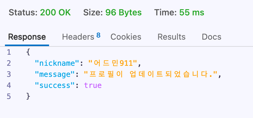원래는 admin911로 설정했었는데, 한글로 바꿔달라고 PATCH 요청을 보내보았다. 그랬더니 아래처럼 응답이 왔다.