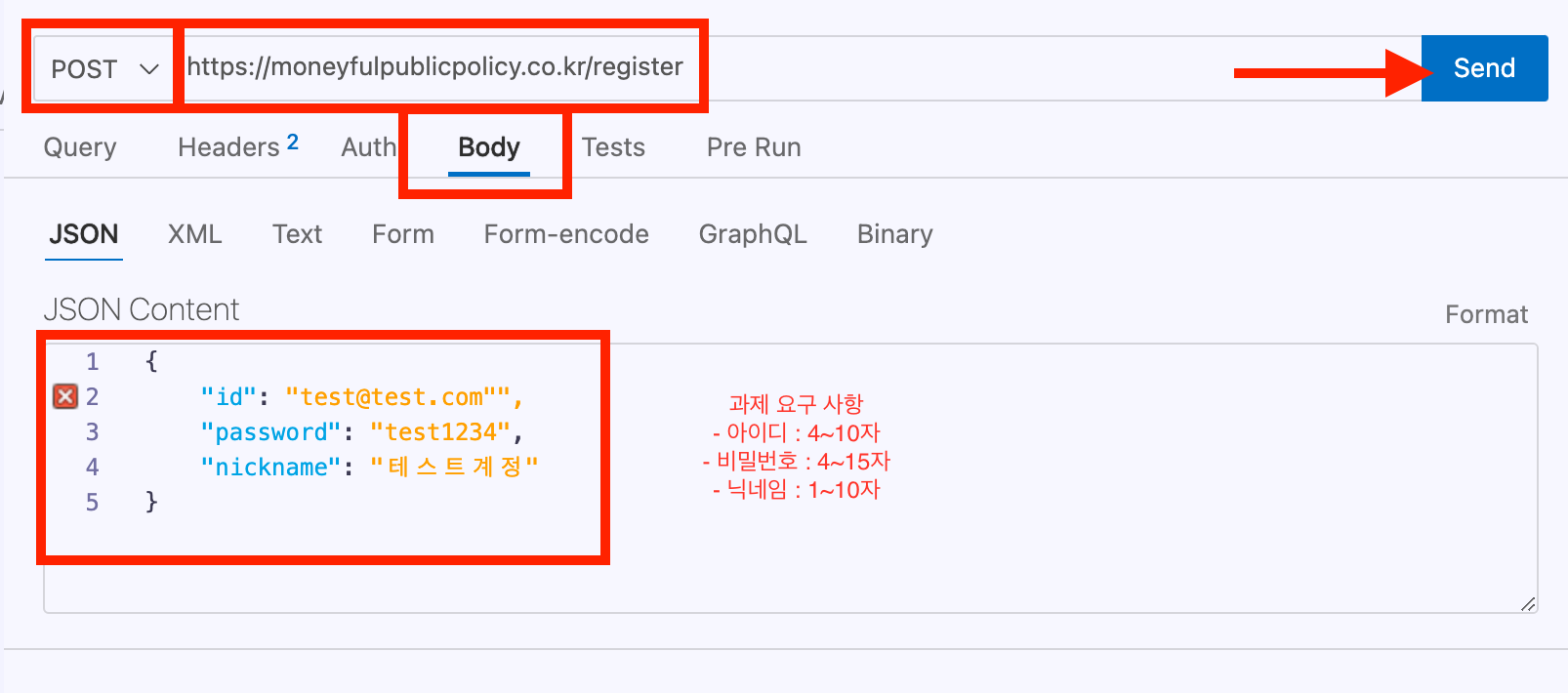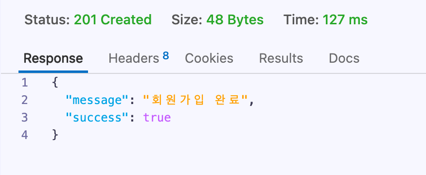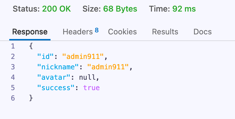 위 백엔드 서버는 나만 사용하는 것이 아니기 때문에 이미 있을 법한 계정을 입력하면 존재하다고 응답이 올 수도 있다.