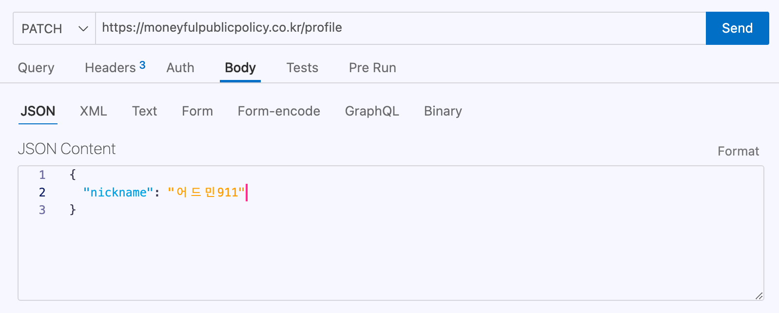 API Method는 PATCH, URL PATH는 /profile이며, 이 유저가 해당 유저 정보를 바꿀 자격이 있는 사람인지 검증해야 하니, Headers에 Authorization을 그대로 추가하고, Barer 토큰 은 그대로 유지한 채로 Body를 아래처럼 바꾸고자 하는 정보를 객체로 작성한다.