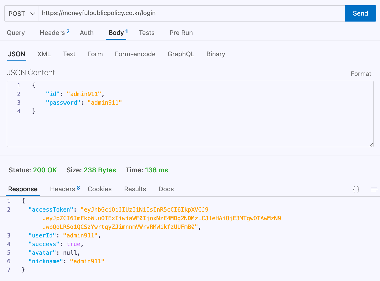 방금 만든 계정으로, URL PATH를 /login으로 변경한 후 로그인에 맞는 Body를 작성해서 Send로 POST 요청을 보내보면