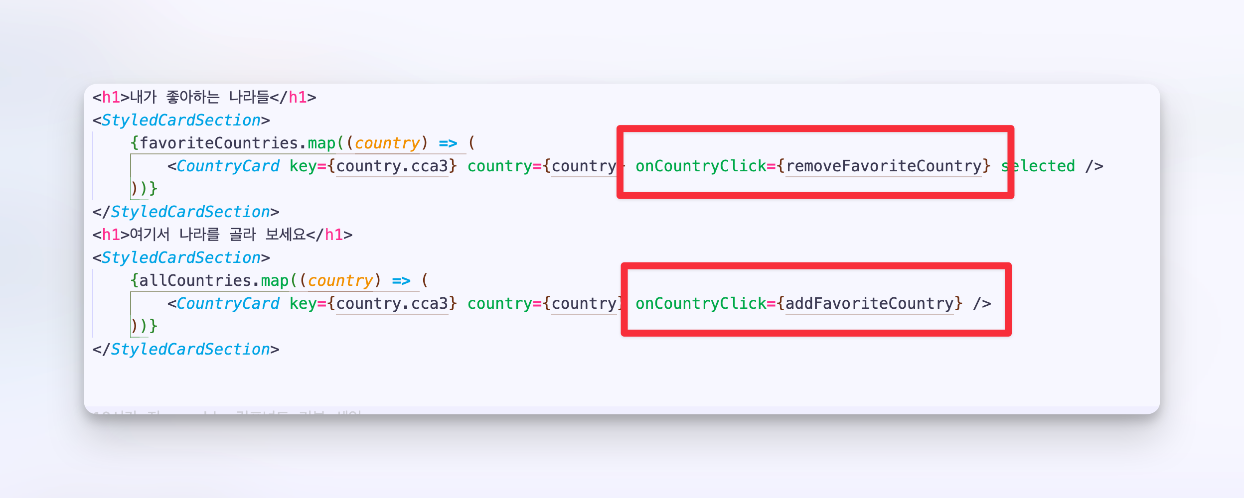 함수는 이미 List 컴포넌트에서 onCountryClick props로 위 아래 카드 컴포넌트가 add, remove로 다른 이벤트 핸들러를 내려주고 있다.