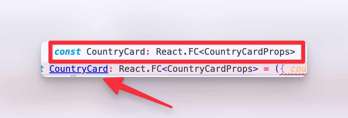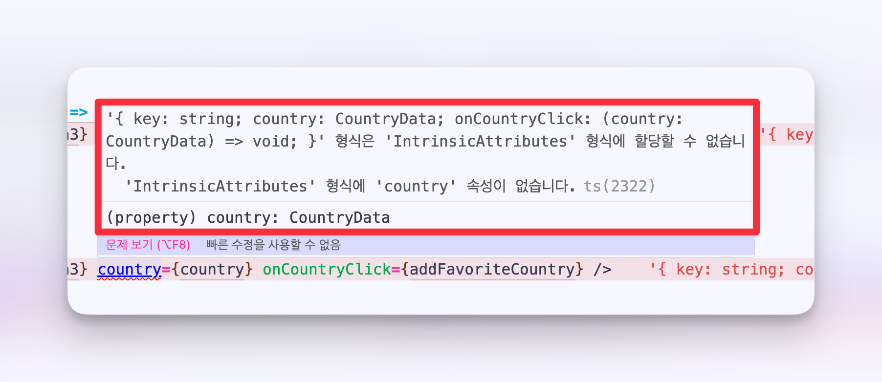 - 매개 변수의 타입을 지정해주어야 한다. 이 타입은 이미 CountryData 타입 파일에 지정했다. 그러나 위에 했던 것들과 차이가 있다면, 객체 하나(아이템)이기 때문에 CountryData[] 이렇게 배열 표시를 하지 않는다.