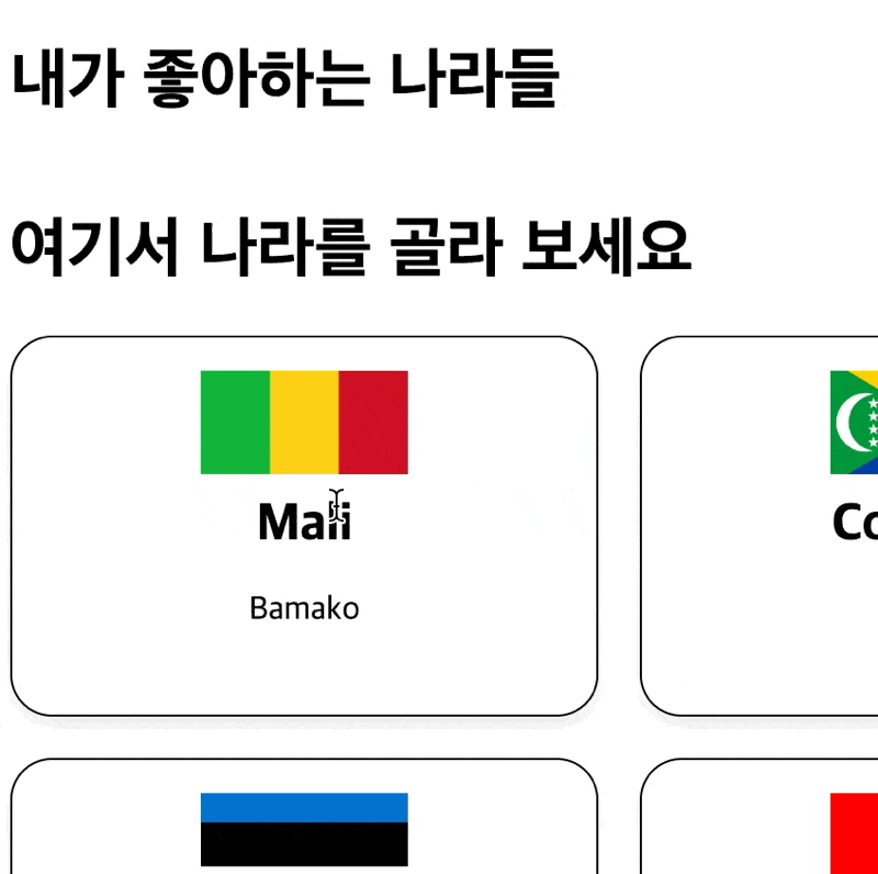 기본적으로 위 아래로 섹션이 나누어져 있고, 아래 국가목록 영역에 전체 카드가 렌더링 되고, 선택하면 내가 고른 카드 영역으로 이동되게 구현할 것이다.