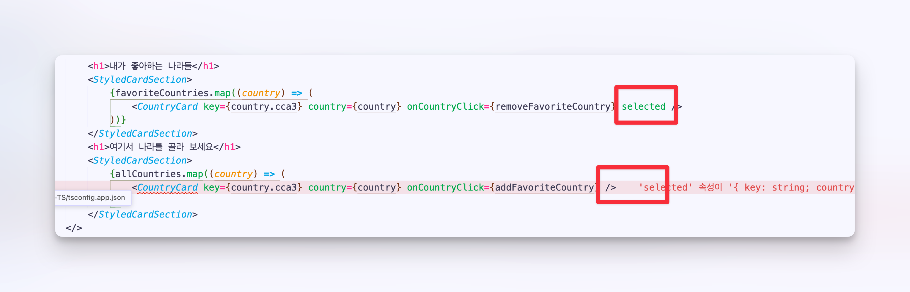 - 이 항목이 옵셔널 한 이유는 아래 사진을 보자. favoriteCountries에는 selected의 불리언 값이 조건부 스타일링을 위해 필요하고, allCountries에는 selected의 불리언 값이 필요가 없기 때문에 선택적으로 있을 수도 있고 없을 수도 있기 때문이다.