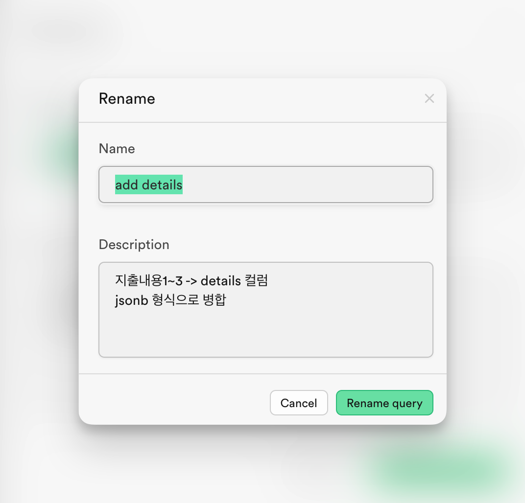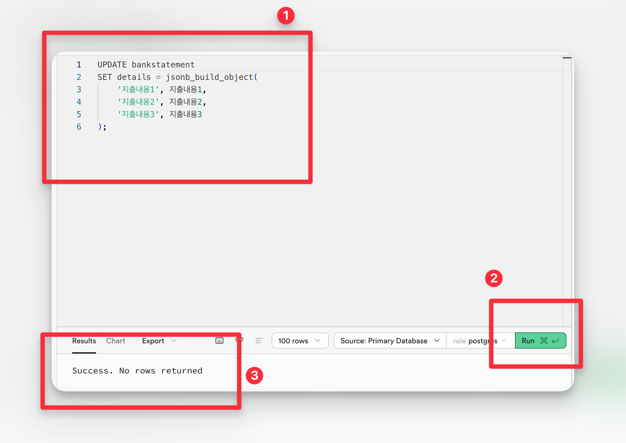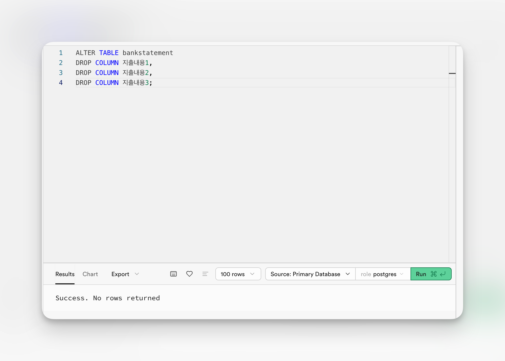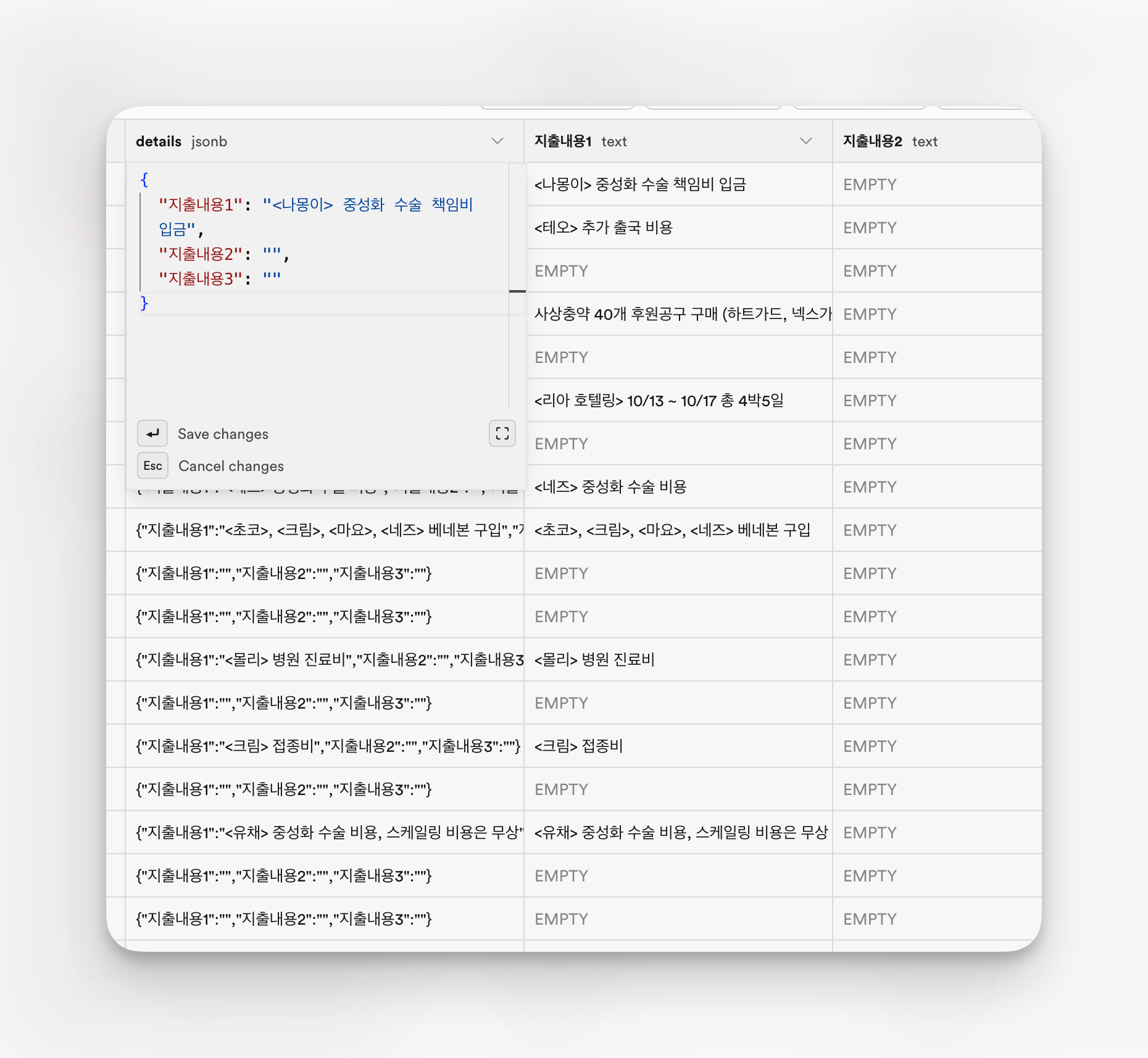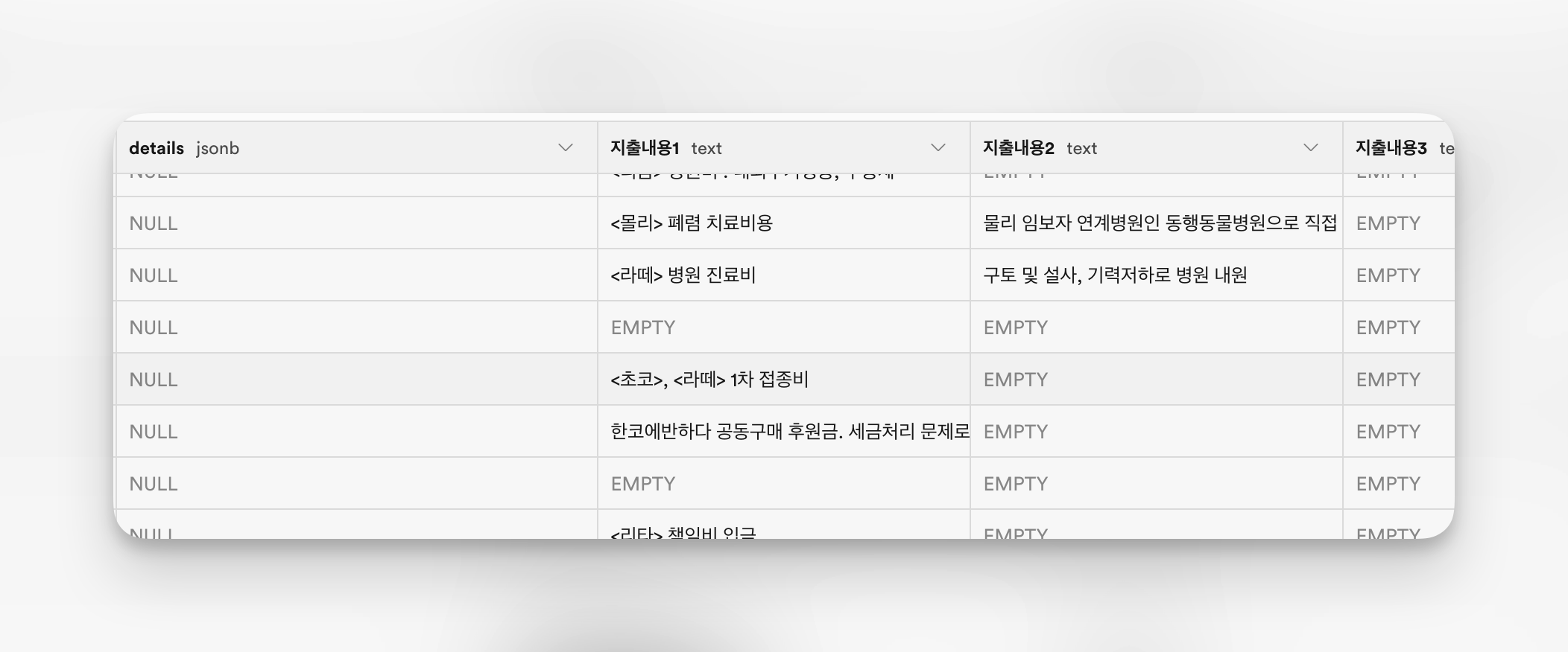 이제 지출내용1~3은 필요 없으니 수동으로 supabase에서 삭제해줘도 되고, 개수가 많다면 SQL 쿼리로 한 번에 작업해도 된다.