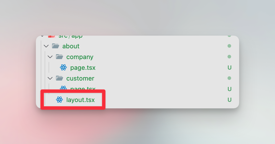 그렇지만 layout.tsx는 about 폴더 내에 위치하고 있기 때문에 여기에 레이아웃을 작성하면 about 폴더 내에 있는 모든 라우트에 공통 레이아웃이 적용된다.