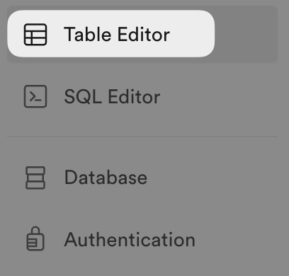 뭐가 된 것 같은데 수파베이스로 가보겠다. 왼쪽 사이드 패널에서 Table Editor로 들어가보면 데이터베이스를 볼 수 있다.