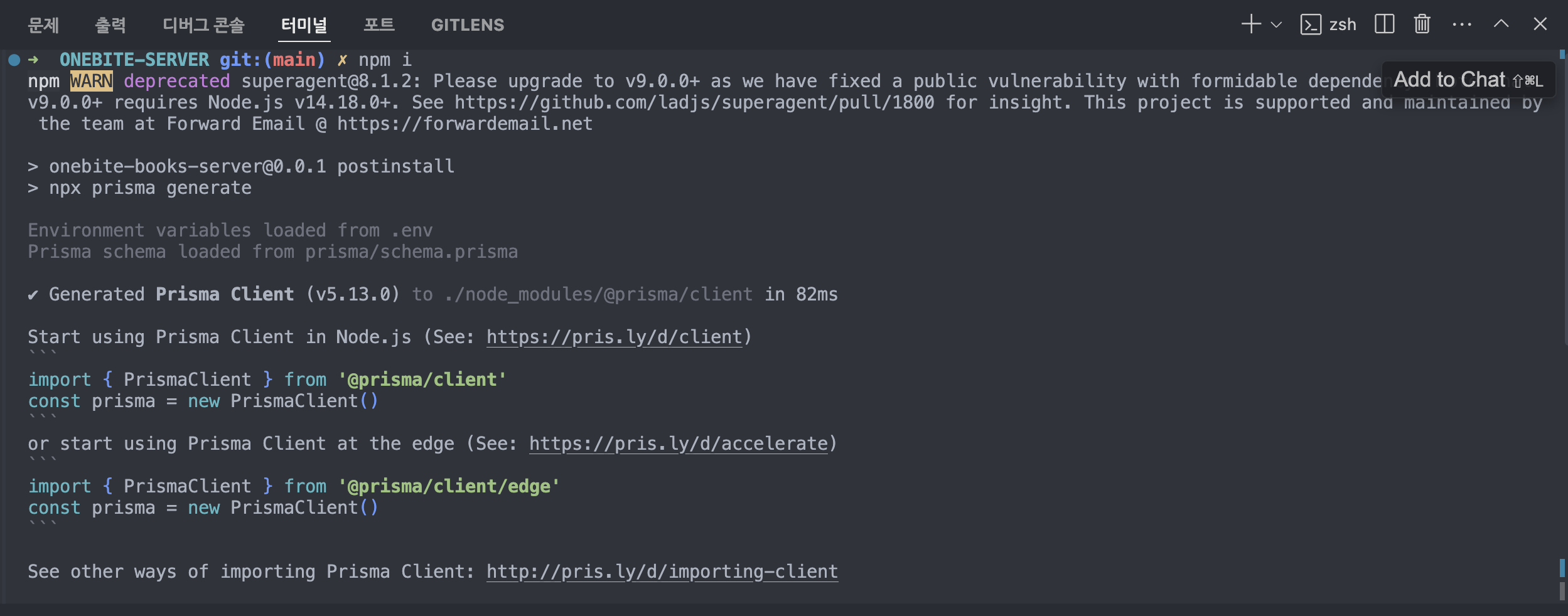 일단 위 백엔드 서버를 클론 받았다면 이 서버는 package-lock.json이라는 파일로 미루어보아 패키지 매니저를 npm으로 사용한 것 같으니 npm i를 입력해서 모든 의존성을 설치해준다.