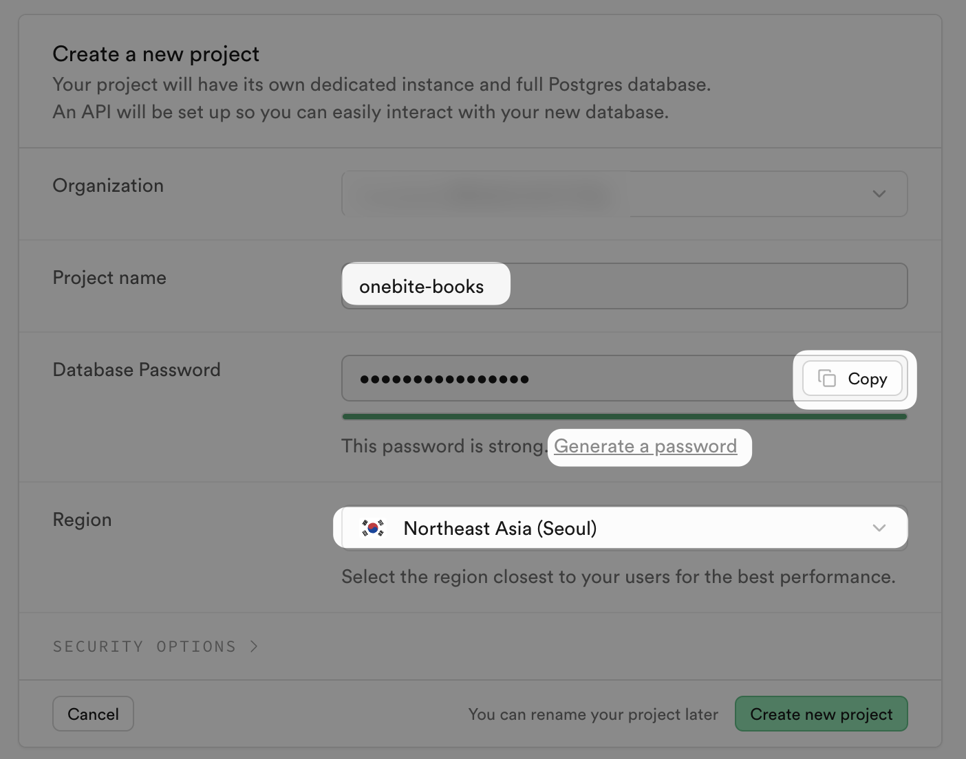 프로젝트 이름은 자유작명이고, 패스워드는 자동으로 생성시킨 다음 복사를 해두자. 혼자서 풀 스택 앱을 만들 때 백엔드 서버를 구성하지 않았다면 데이터베이스 패스워드가 필요 없었지만 이번에는 필요하다. 그런데 까먹어도 상관은 없다. 지금 메모 해두지 않으면 나중에 데이터베이스 패스워드를 다시 볼 순 없지만 다시 리셋시킬 순 있다.