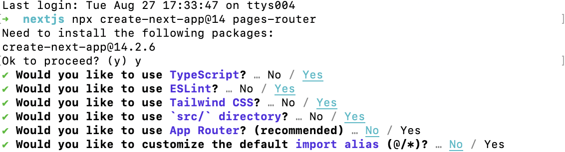 - 사용할 거면 Yes지만, 지금은 Pages Router 방식을 사용할 것이므로 No를 선택하겠다.