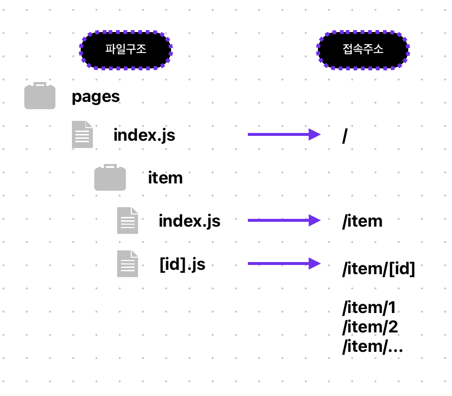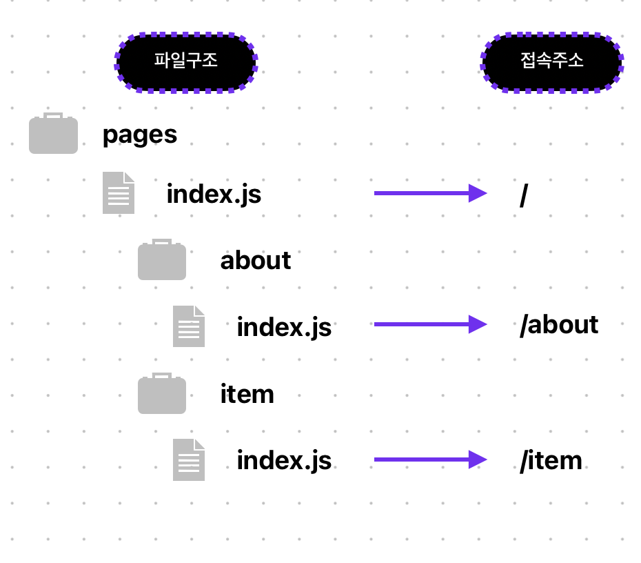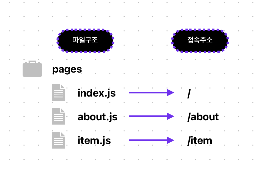 pages라는 폴더 안에 index.js를 만들면 그게 메인 페이지가 되고 접속 세그먼트는 /가 된다. 그리고 만드는 파일명에 따라서 각각의 접속 세그먼트를 갖게 되는 파일명 기반 라우팅 방식이다.