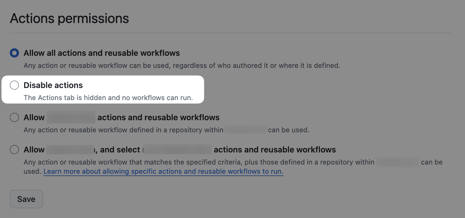 우측 패널에서 Actions permissions 중 Disable actions 클릭 후 save 클릭
