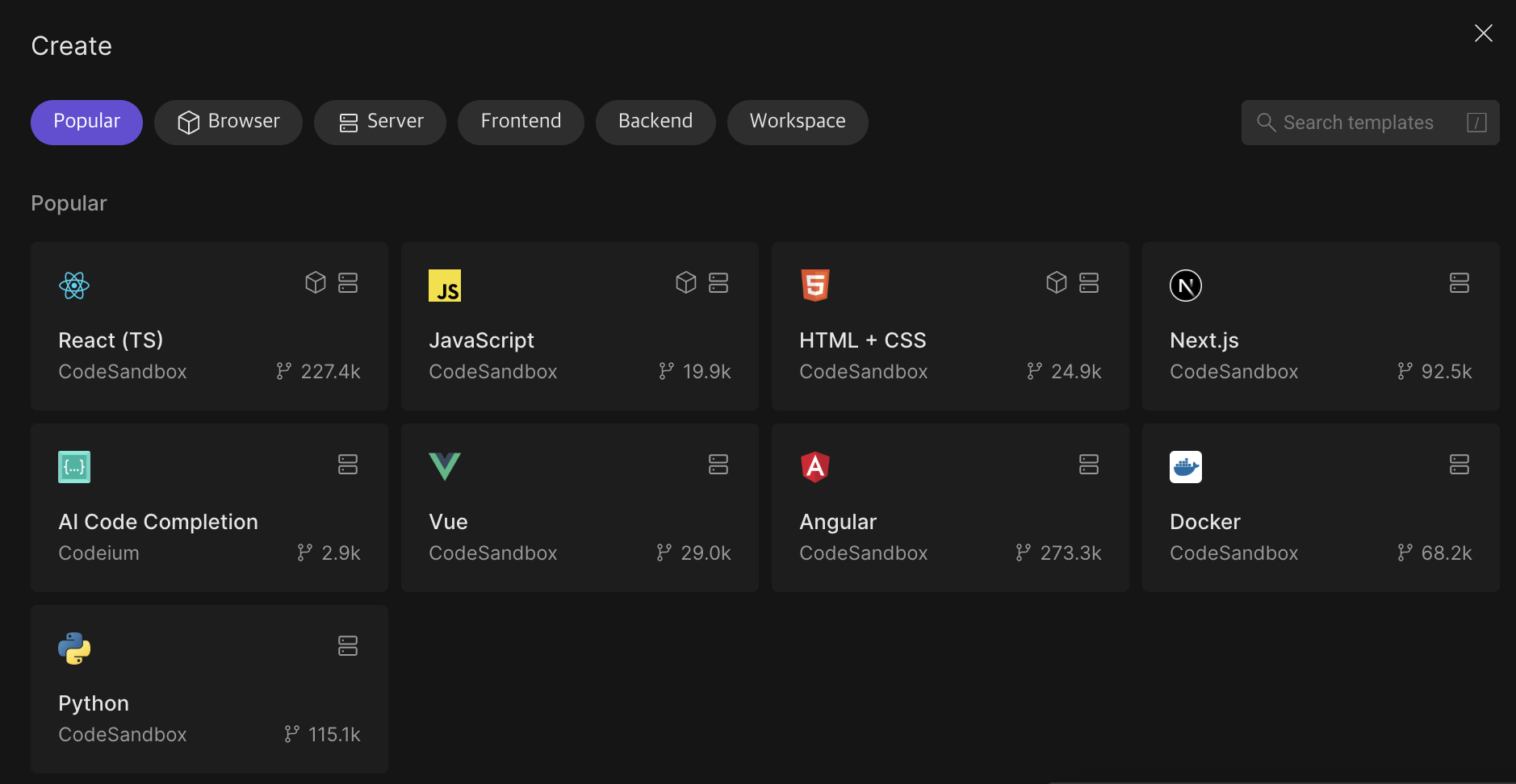 codesandbox.io에 접속하면 에디터가 없는 환경에서도 바닐라 자바스크립트 뿐만 아니라 리액트 등의 라이브러리까지 웹에서 활용하며 간단한 학습을 할 수 있다.