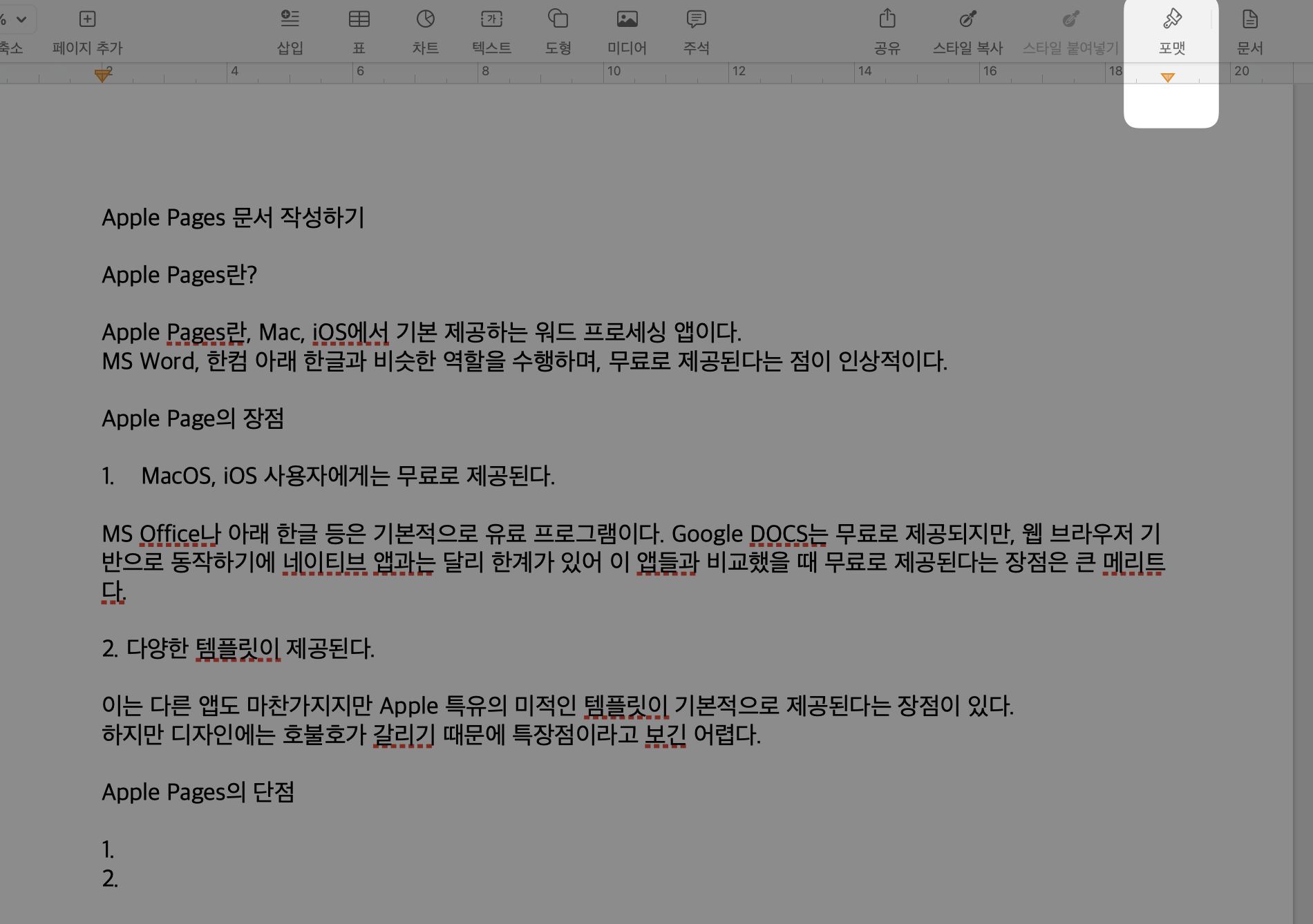 문서를 쭉 작성하고 아이콘 중 포멧을 선택하게 되면 서식과 관련한 설정을 만질 수 있는 사이드바가 오른쪽에 열린다.