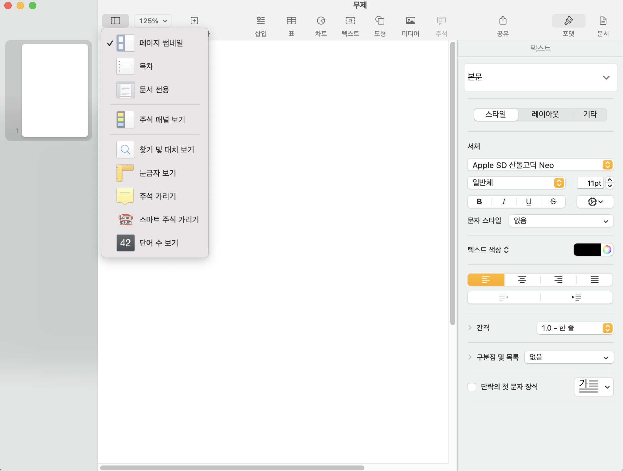 apple pages의 상단 패널은 워드나 한글에 비해 정말 단순하다.