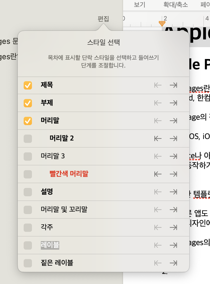 만약 단락 스타일을 선택했는데도 목차가 보이지 않는다면 편집을 눌러서 내가 사용할 단락 스타일을 체크해주면 된다.