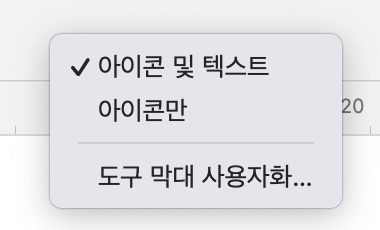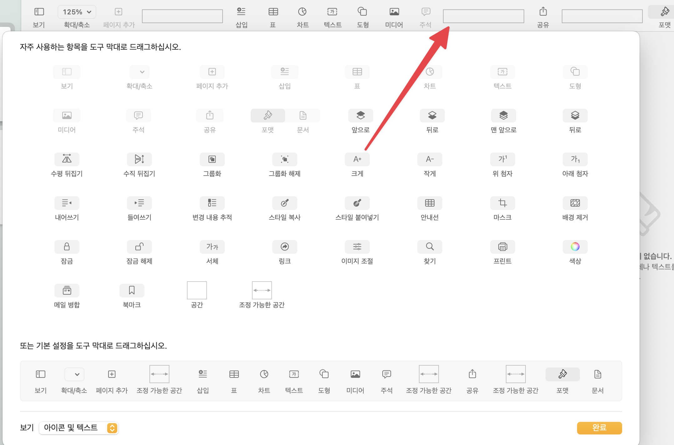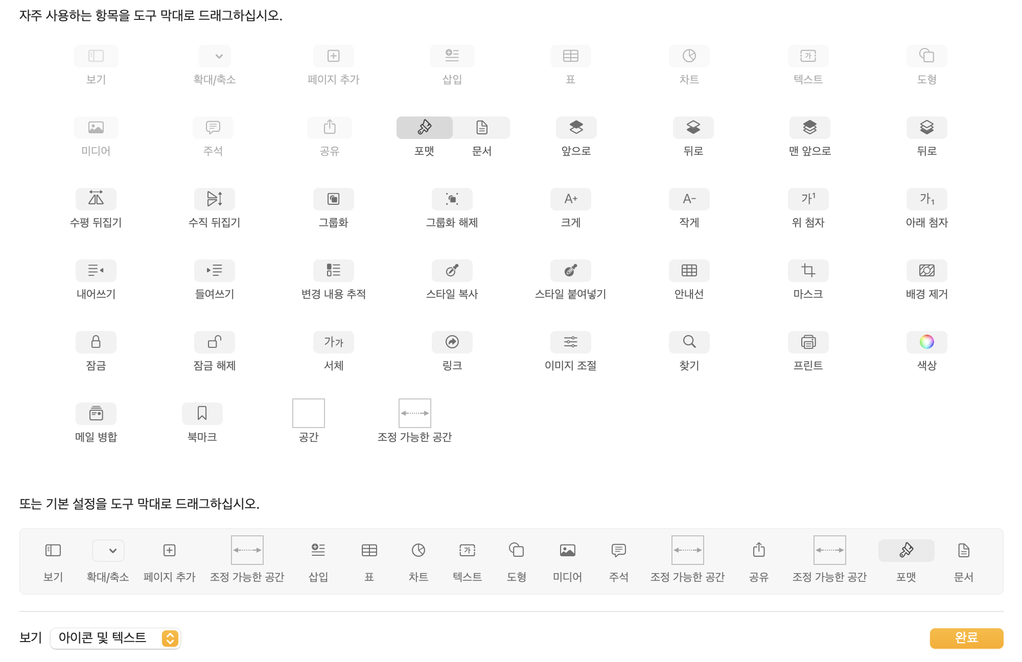 실제 도구 막대 공간에서 비어있는 공간(조정 가능한 공간)에 원하는 기능을 드래그앤드랍하여 추가할 수 있고, 반대로 이미 있는 것을 다시 반대로 끌어다 놓으면 도구 막대에서 빠지게 된다.