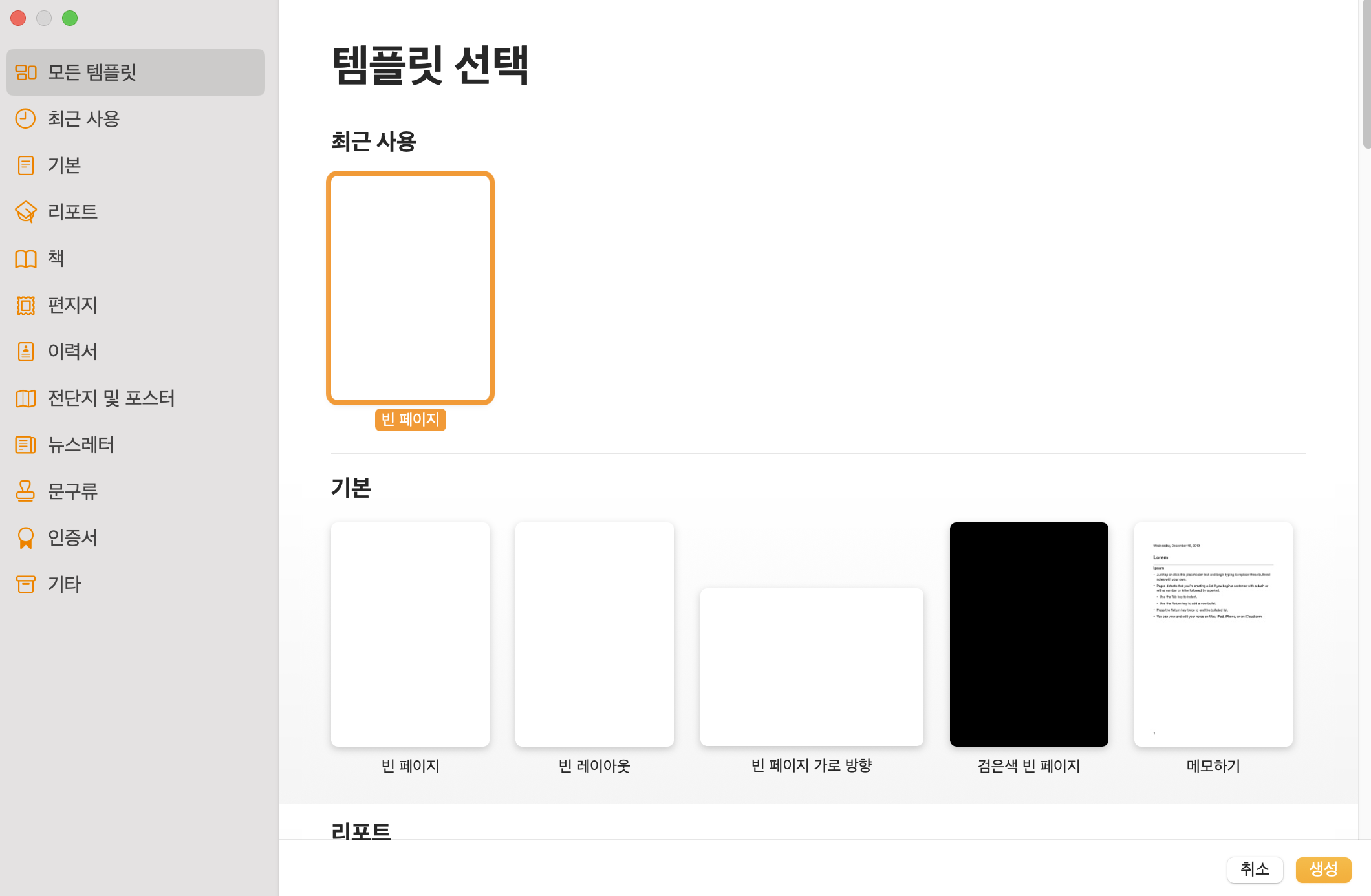 앱을 실행하면 처음으로 등장하는 것은 템플릿 선택할 수 있다.