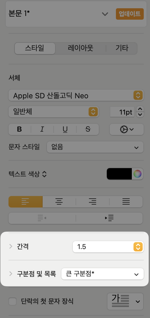 단락 스타일을 커스터마이징 하는 경우, 아래쪽에서 구분점 및 목록에서 적절한 것을 선택해주는 것도 가독성을 높이는 데 도움이 된다.