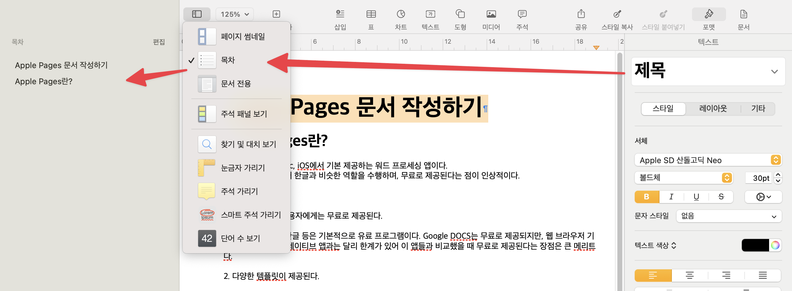 이 단락 스타일에서 미리 정의된 서식을 사용하면, 보기를 눌렀을 때 나오는 목차에 자동으로 목차가 생성되어 더 편리하게 문서를 색인할 수 있다.