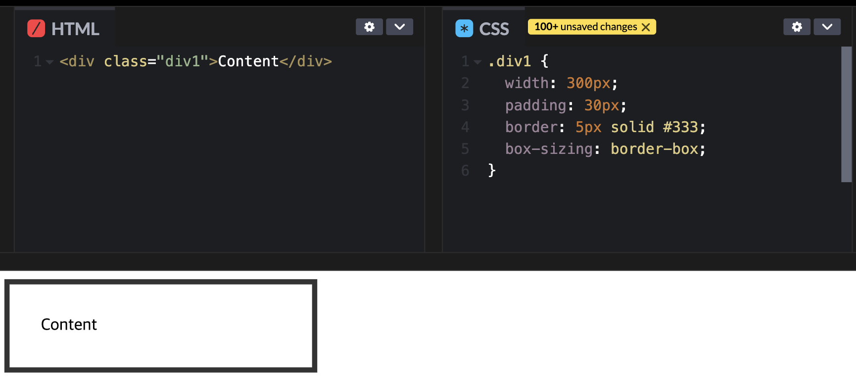 box-sizing: border-box; 속성을 넣으면 .div1 박스 모델의 너비를 300px로 해놓은 게 그대로 적용된다. 하지만 이 속성을 넣지 않으면 content를 기준으로 width를 그려 넣기 때문에 좌우 padding 30px 씩을 더해서 360px로 렌더링 되게 된다.