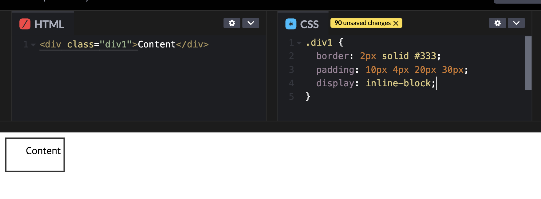즉 위 사진에서 Content의 Padding은 극단적으로 보여주기 위해 설정한 것이지, 상하의 여백은 다르더라도 좌-우는 대칭적으로 하는 경우가 많기 때문에, 속성의 값을 3개만 넣었을 때 좌-우는 동일하게 처리한다는 점을 기억하면 된다.