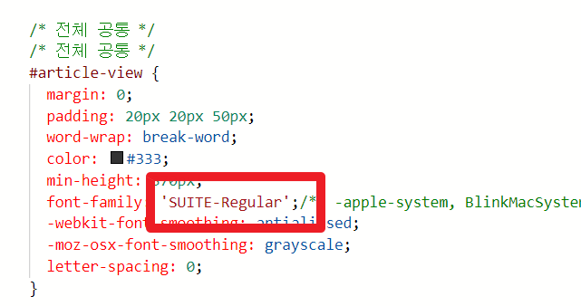 위 사진은 'SUITE-Regular' 라는 폰트를 넣은 모습이고, 뒤의 폰트는 티스토리에서 기본으로 설정된 폰트인데 어디에 사용되는지 확인해보기 위해 /**/로 묶어 주석처리 한 것으로 따라하지 않아도 된다.