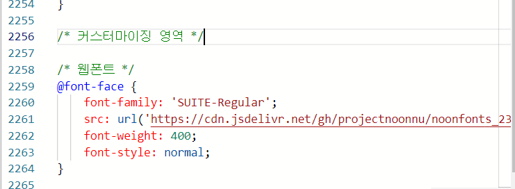 다른 폰트로 적용하고 싶으면 눈누에서 복사한 폰트를 아까 붙여넣은 곳 밑에 계속 여러번 붙여 넣어도 상관없다.