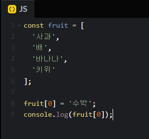 그런데 const로 변수를 선언하면 값을 바꿀 수 없지만 array에서는 가능하다.