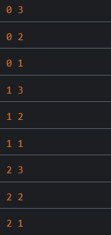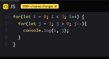 중괄호 안의 코드인 콘솔이 i와 j를 출력한 후 (i는 1, j는 3) j를 한 단계 감소시키고 다시 시작한다.