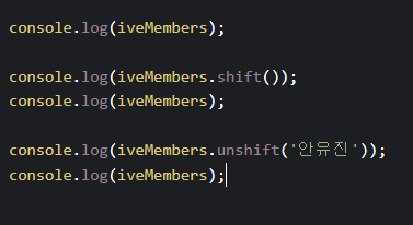 iveMembers.unshift('안유진')으로 첫번째 인덱스에 안유진을 넣었더니 다시 어레이에 포함되었다.