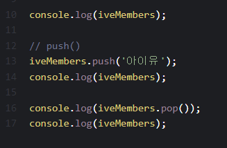 그리고 콘솔에서 console.log(iveMembers.pop()); pop를 넣었더니 아이유를 반환했다.